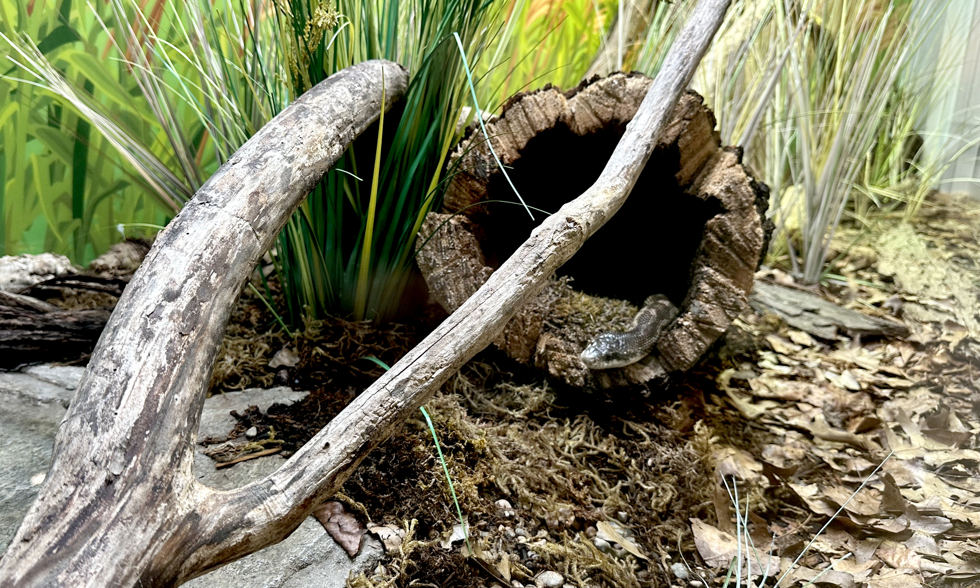 Black rat snakes can grow to be an impressive 8 feet long – but don’t worry, they are non-venomous and harmless to humans. Rodents, however, are not so lucky. As their name suggests, this species hunts rats and will often enter barns or abandoned buildings in search of food. They use the constriction method of hunting and consume their prey in a single bite! Rat snakes can also be found hiding in tall grasses, under fallen trees or in hallowed out logs, just like our friend here, who just emerging after a taking a nice afternoon nap. The habitats at the Belle Isle Nature Center are designed to mirror the landscape the species might experience in the wild – do any of the elements look familiar to you?